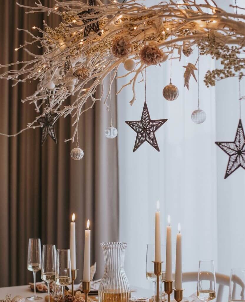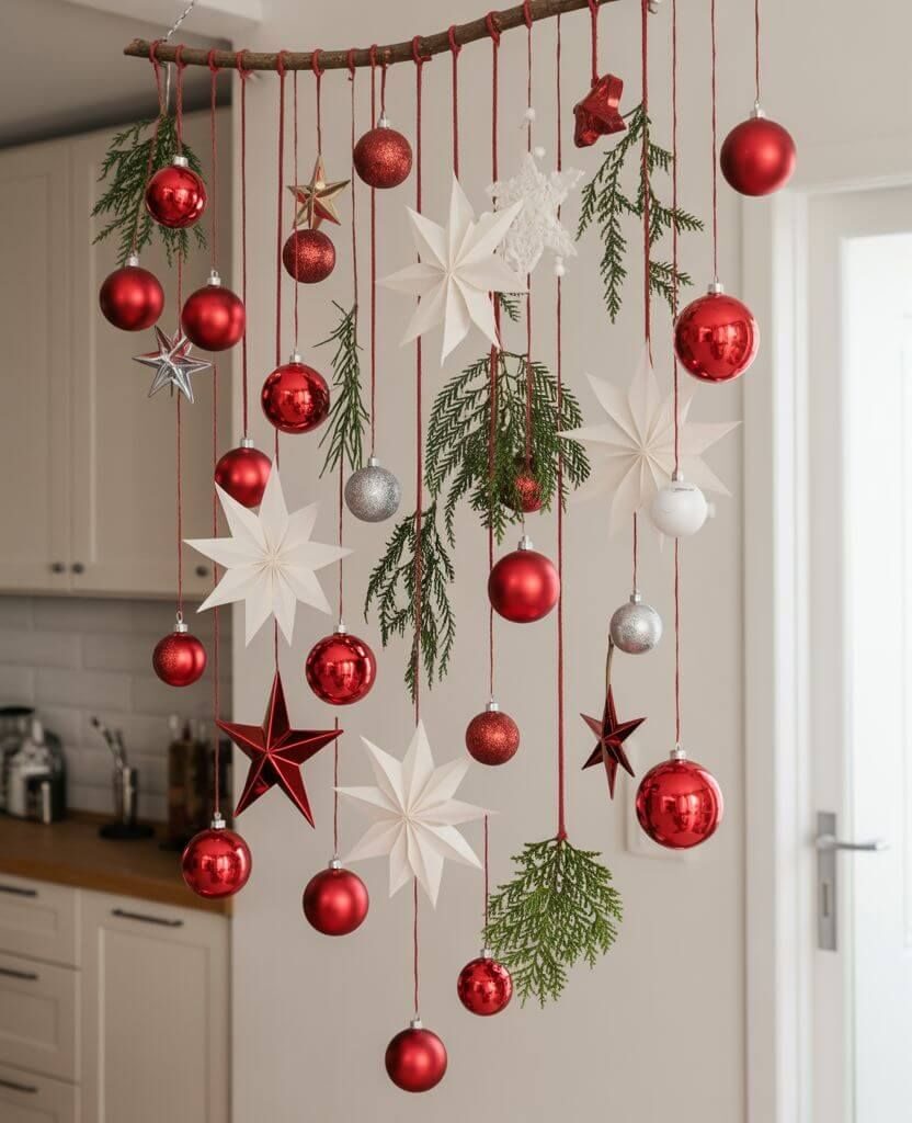 Mix ornaments in different textures — matte, shiny, and glittery — for a more dynamic, layered look. You can even hang tiny bells to create a soft jingle when the air moves.