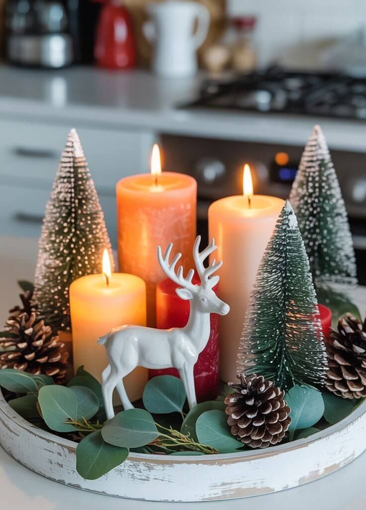 If your kitchen has an island or a wide countertop, a cozy Christmas tray is the easiest way to make it festive without clutter. Fill a rustic wooden tray with candles, mini Christmas trees, pinecones, and a few ornaments in soft red or gold. It’s warm, simple, and effortlessly stylish — like a little holiday vignette in the heart of your kitchen.