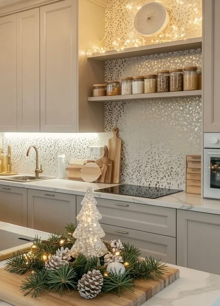 Sometimes, all you need is the right lighting to make your kitchen feel festive. Warm string lights, fairy lights under cabinets, or candles on the counter create that magical glow that feels like home.