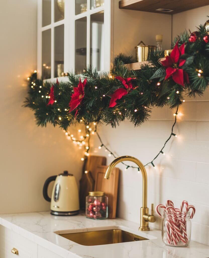 Drape fairy lights along your shelves or above the backsplash, and mix them with small evergreen sprigs for a soft, natural touch.