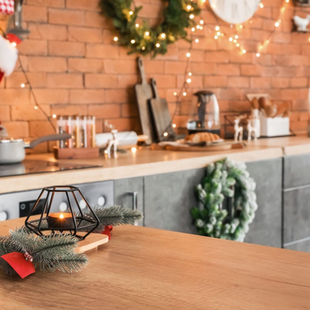 Between baking and wrapping gifts, kitchen counters can get busy. Choose lightweight decor — like trays and garlands — that you can easily move when cooking. This way, your kitchen stays both festive and functional.