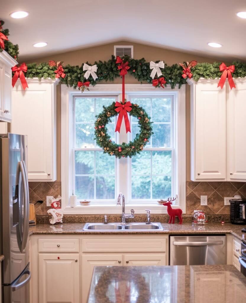 Small wreaths hanging from cabinet doors are an easy and elegant way to transform your kitchen. Add red ribbons, tiny ornaments, or dried orange slices for a rustic touch.