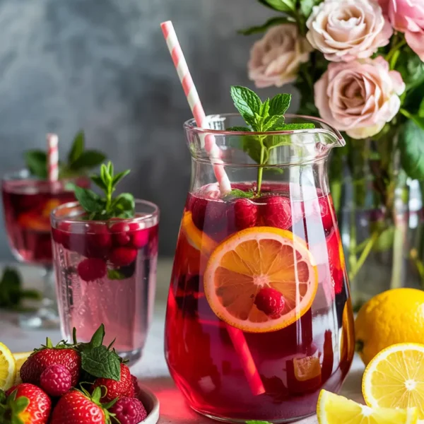 This is the most visually impressive mocktail on the list — a deep pink, fruit-filled jug that looks exactly like sangria and produces immediate conversation when placed on the table.