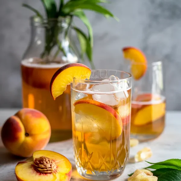 Method: Mix peach nectar, orange juice, and honey in a jug. Add ginger beer and top with sparkling water. Serve over ice. Garnish with a fresh peach slice and a piece of crystallised ginger on the rim.