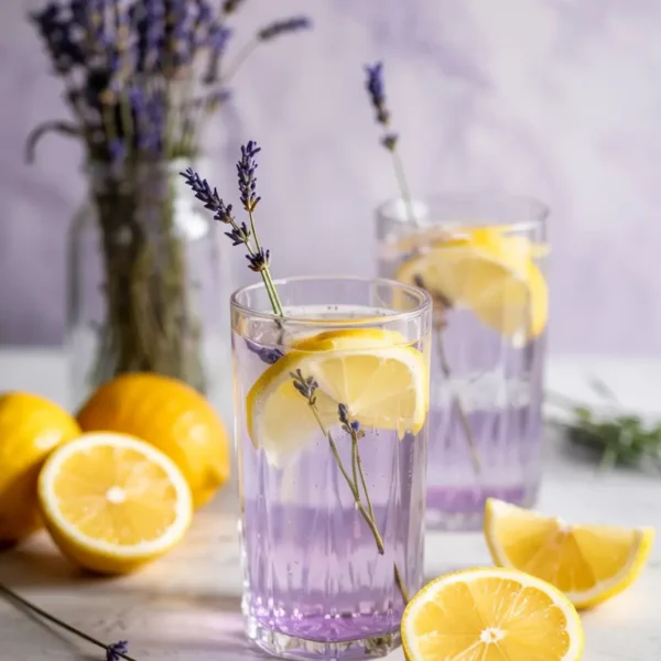 • Ice, lemon slices, fresh or dried lavender sprigs to garnish