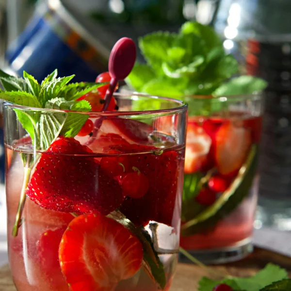 • Fresh berries (raspberries, strawberries, blueberries) – particularly effective floating in a pale drink