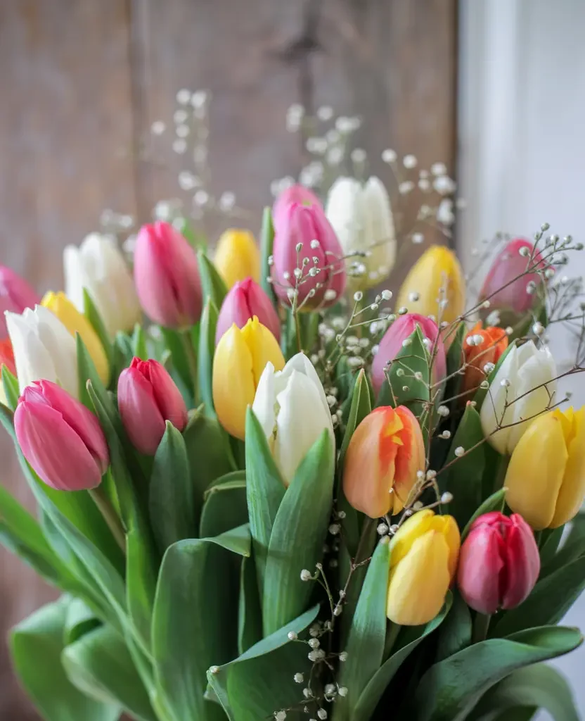 Tulips are the most underrated wedding flower. They are in peak season from March through May, available in almost every color, extremely inexpensive in bulk and — when styled simply and well — absolutely beautiful in wedding photographs. A bridal bouquet of 30 tulips costs $15–$25 in materials and looks as intentional and elegant as a bouquet that cost $300 from a florist.