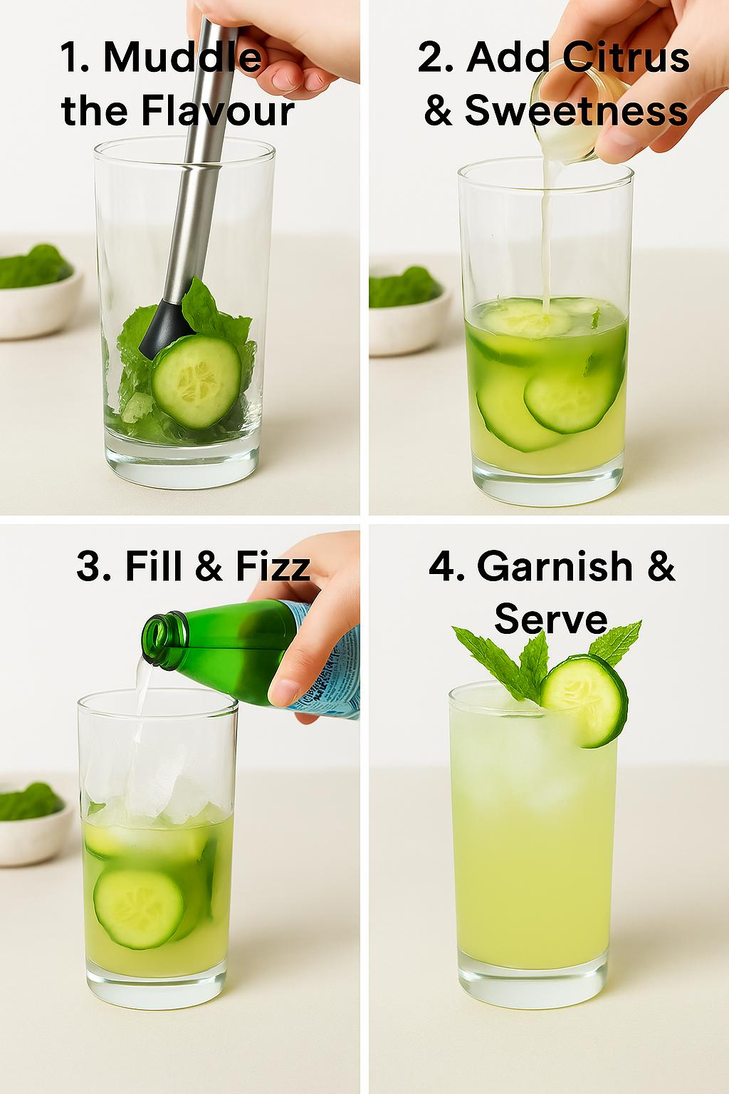 In a tall glass, gently muddle the cucumber slices and mint leaves using a muddler or the back of a spoon to release their natural oils and juices.
