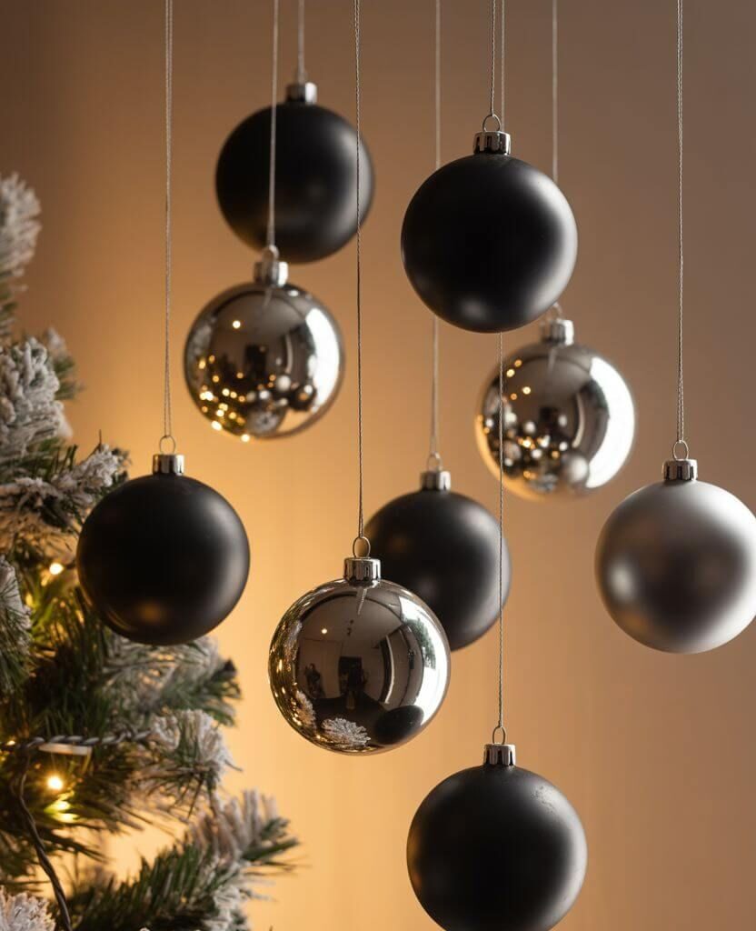 - Matte black baubles for sophistication.