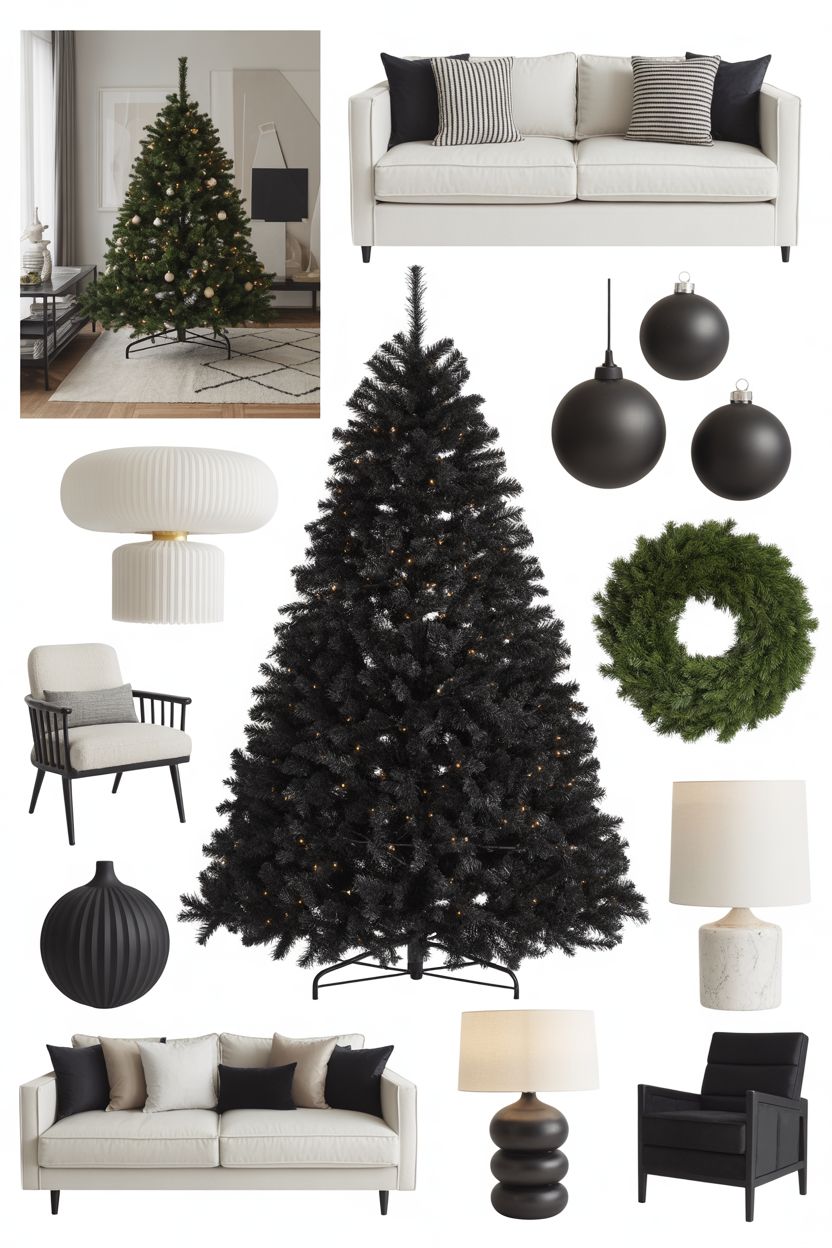 Try a modern black holiday aesthetic by pairing black ornaments with beige tones, wood textures, or glass details.