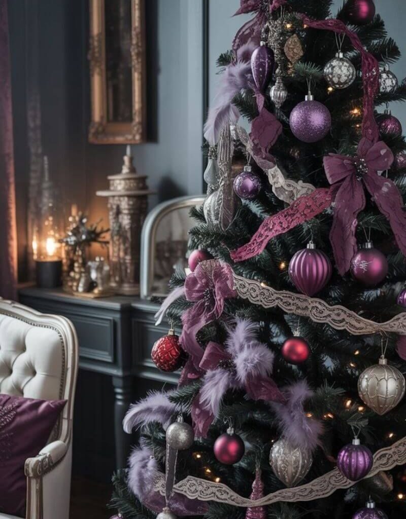 Decorate your black tree with deep purple ornaments, dark red roses, and vintage silver baubles.