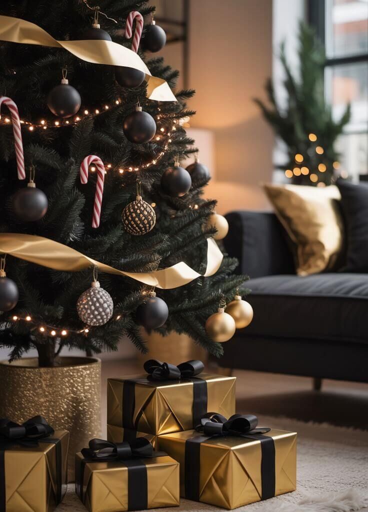 A black and gold Christmas tree looks regal and timeless — perfect for a chic living room.