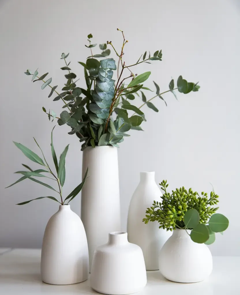 - Bathroom: a small bud vase with eucalyptus on the bathroom shelf