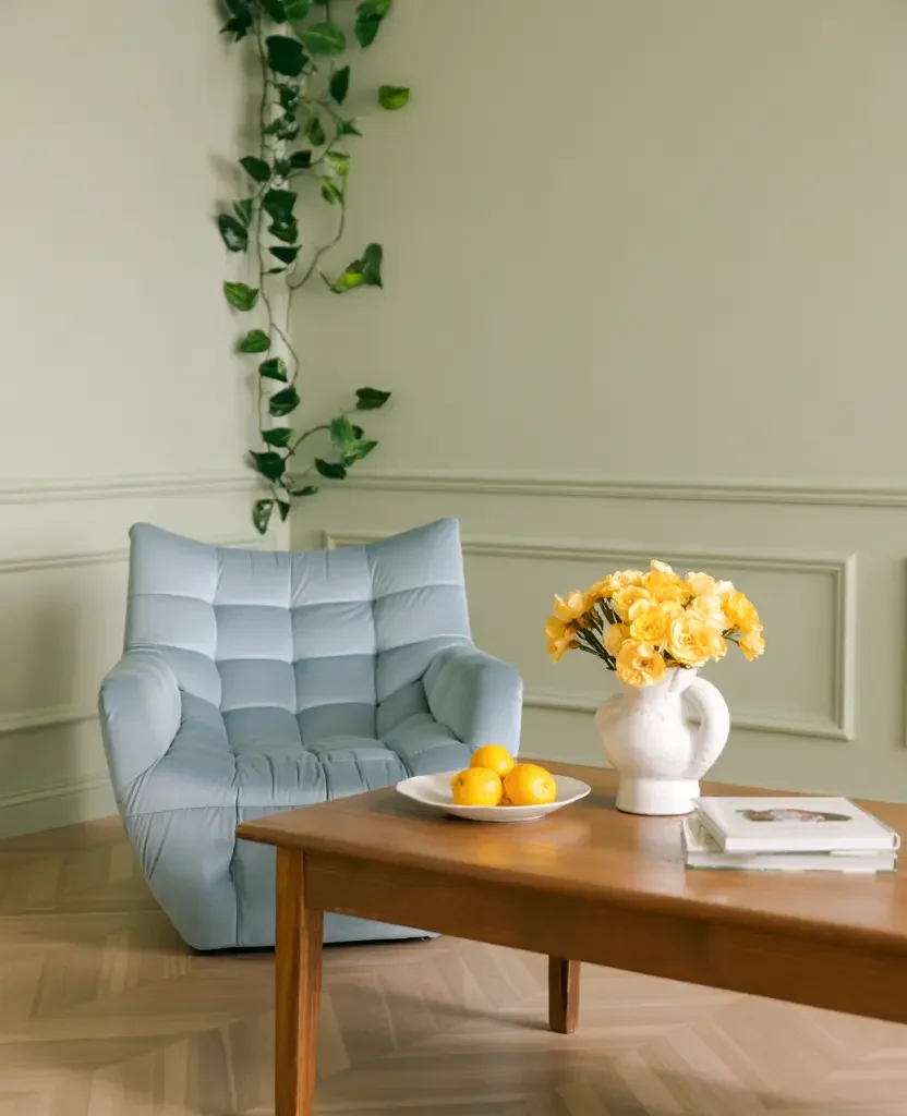 Start with the capsule living room: a linen throw in sage, a single statement plant and one ceramic vase with seasonal stems. That is the modern spring room in its simplest form — and it is beautiful.