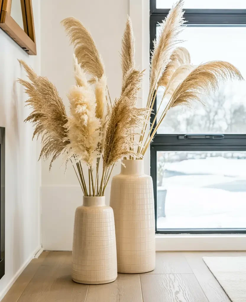 - Living room: a large ceramic vase with tall dried pampas or fresh branches — floor height, in a corner