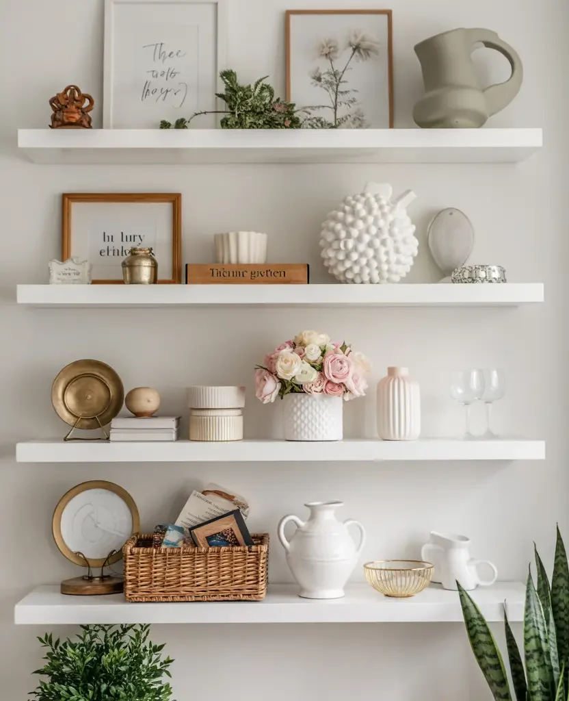 - Considered negative space: empty areas of wall and shelf treated as intentional design decisions