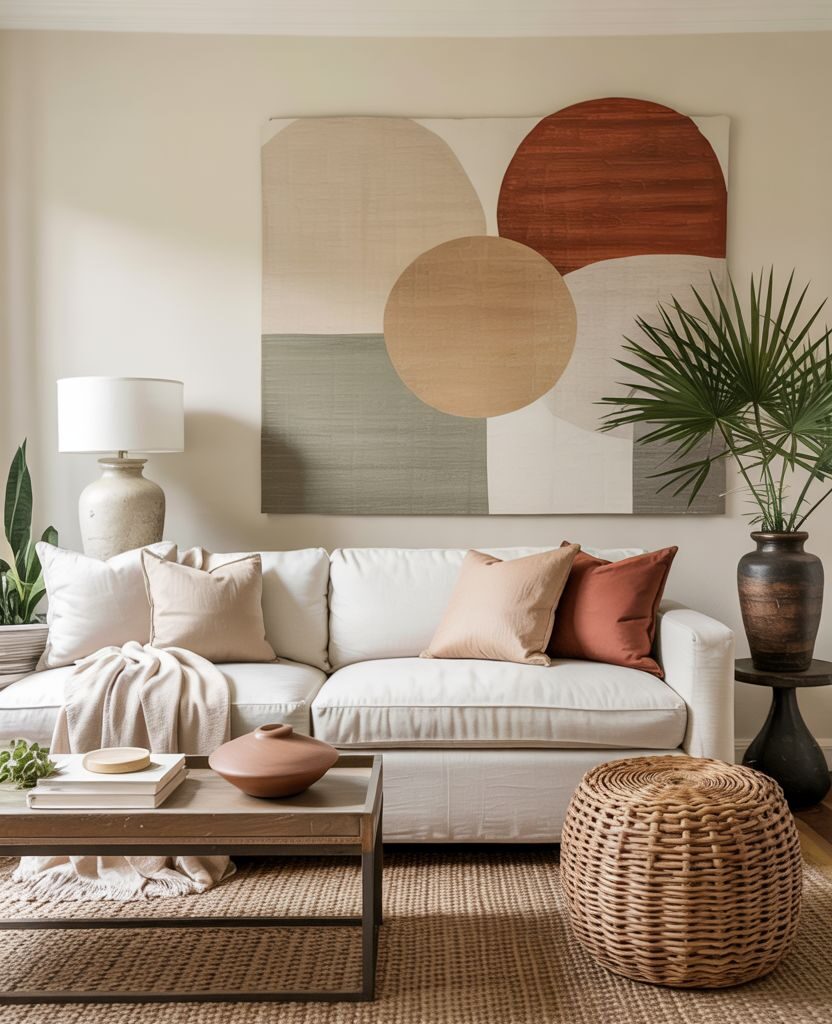 • Accent (15%): sage green or dusty blush — for cushions, smaller ceramics