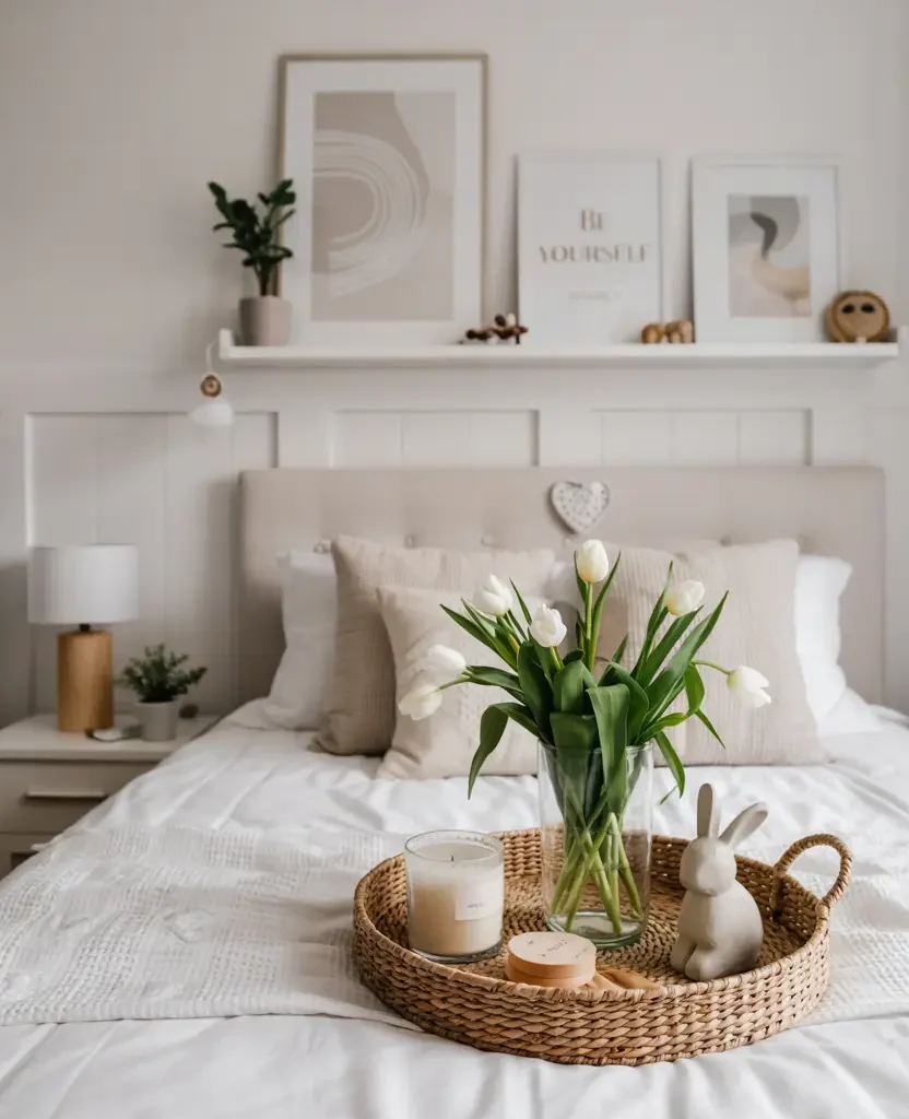 The neutral bedroom requires discipline: remove anything that does not belong. The phone charger, the stacks of books, the miscellaneous items on the bedside table. The neutral spring bedroom is edited, not accumulated.