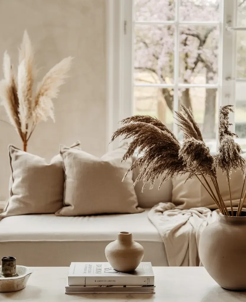 neutral spring living room 2026 styled with cream sofa sage cushions and pampas grass
