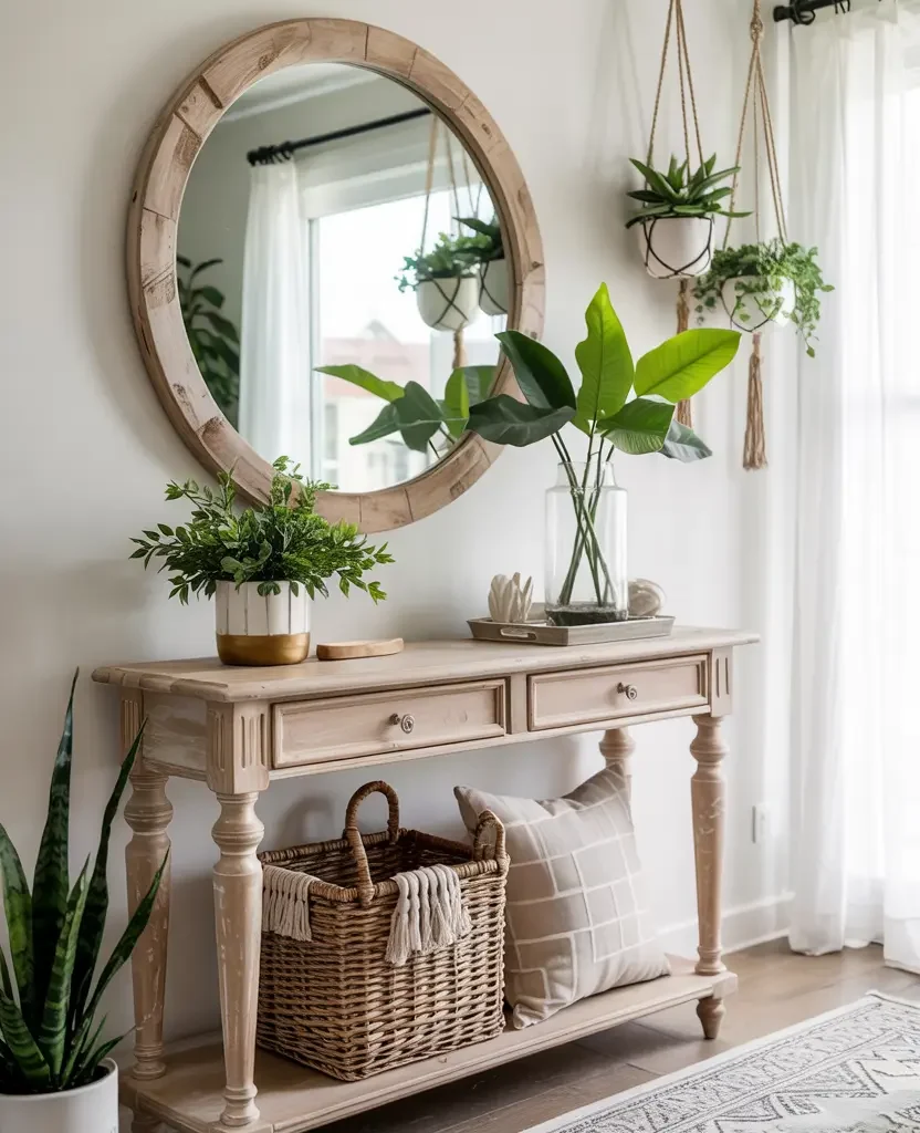 - A wooden bench or console table as the entry anchor