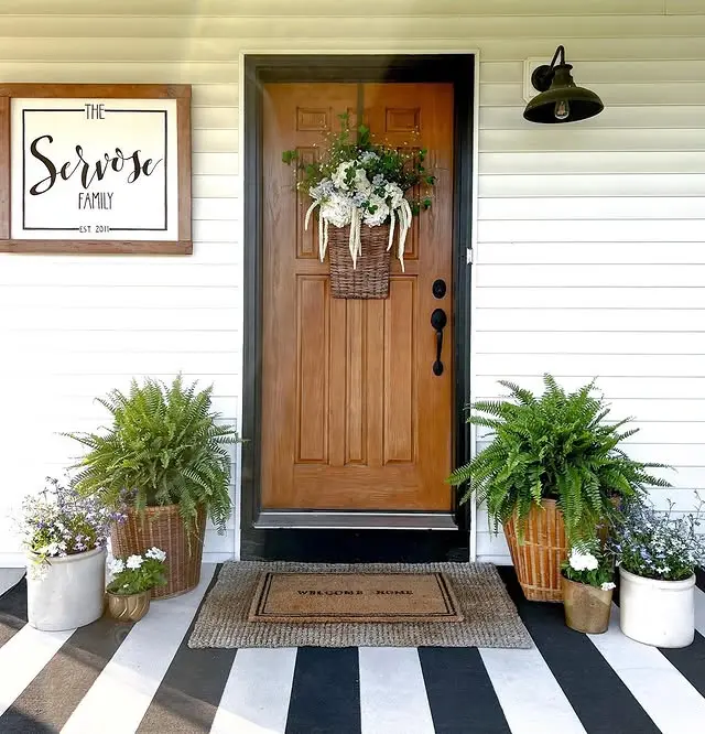 - Potted plants: terracotta pots with spring herbs or flowers on the steps or in the entry