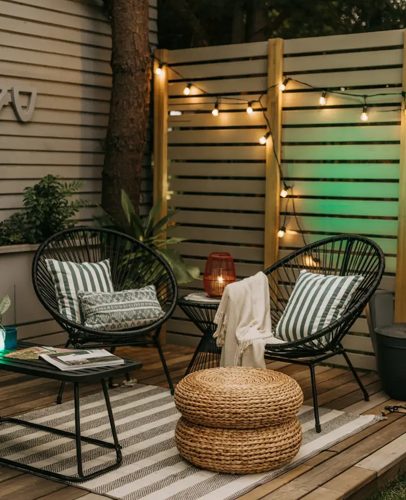 Soft, warm lighting instantly transforms a tiny patio into a cozy retreat.