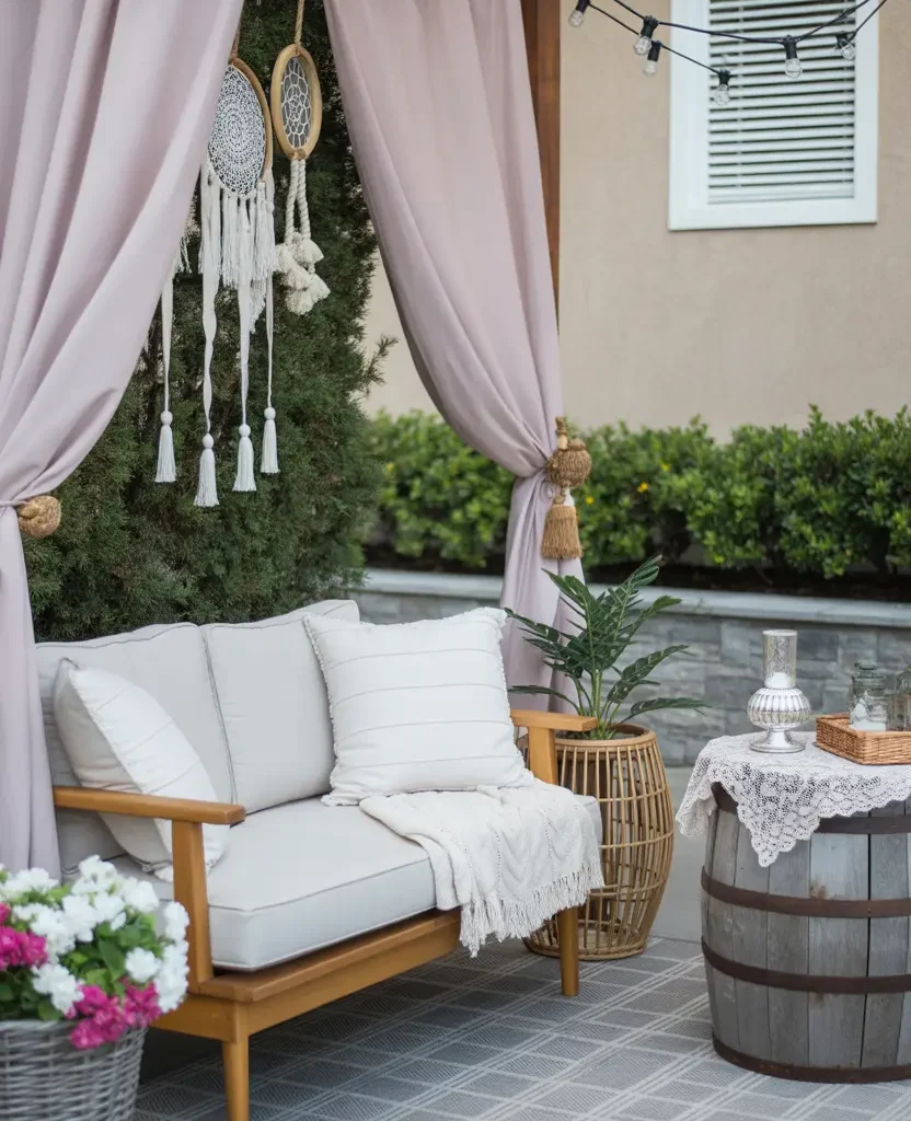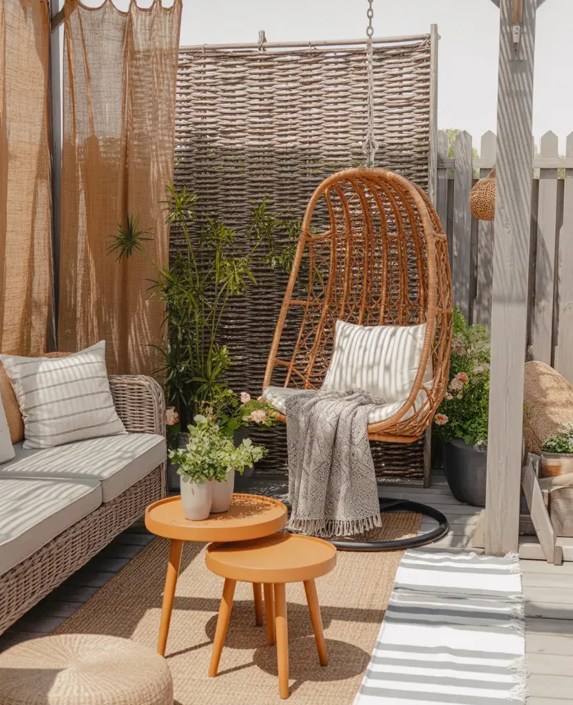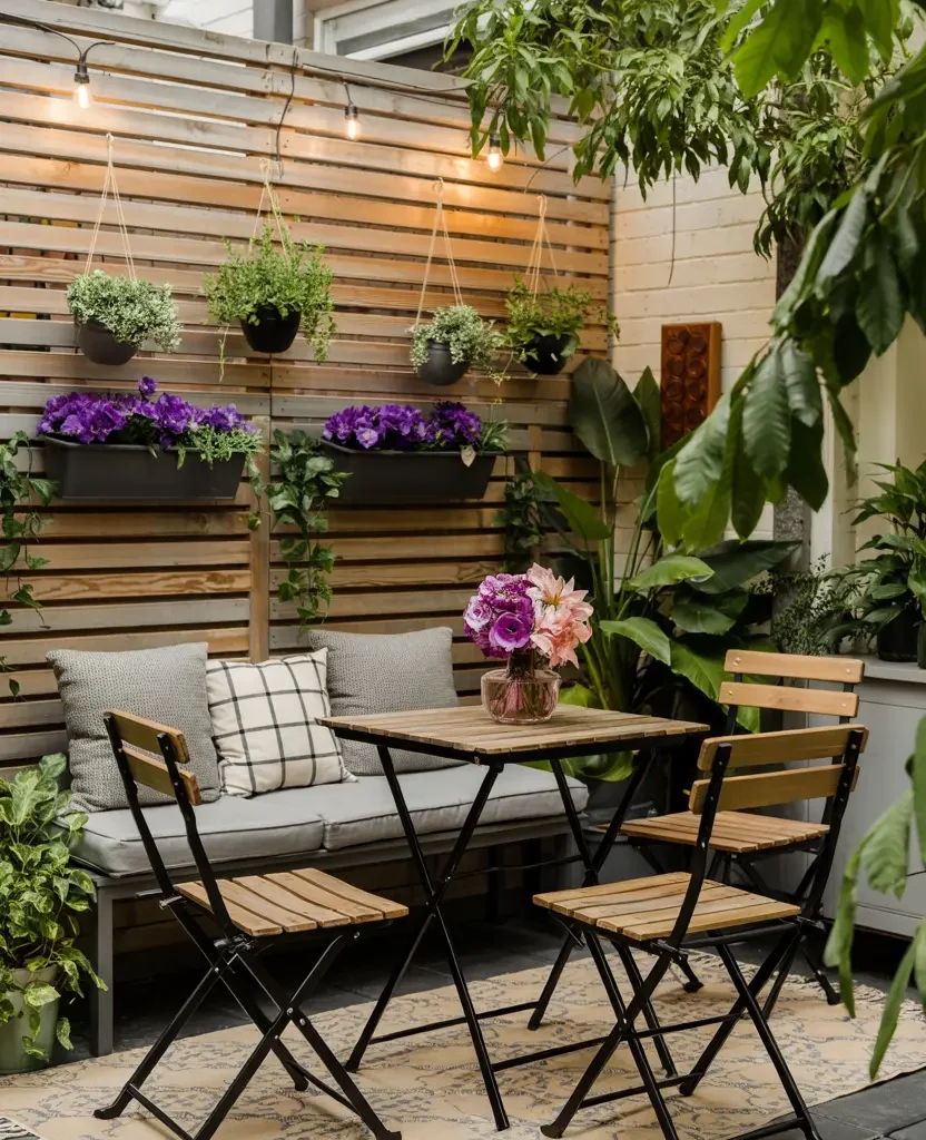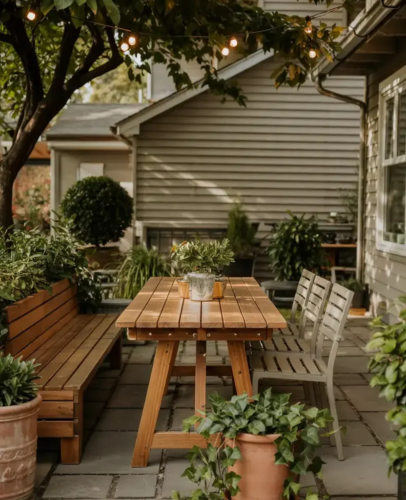 The most effective tiny patio ideas focus on vertical elements and flexible furniture. Wall-mounted planters, hanging lights, foldable chairs, and built-in benches help maximize space without overwhelming a tiny backyard.
