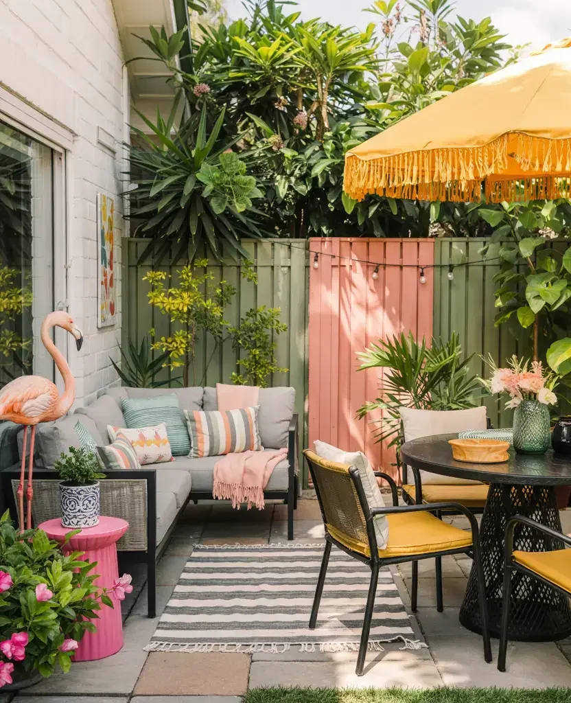 These colors help a tiny backyard patio feel breathable instead of crowded.