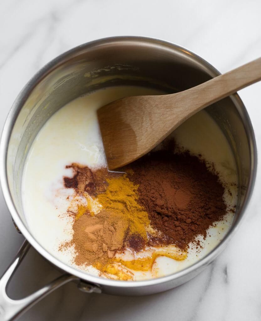 Add cinnamon, ginger, and if desired, a tiny pinch of cayenne. Stir slowly to let the flavours mingle. The kitchen will fill with the aroma of chocolate and spice.