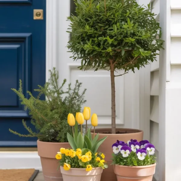 When exploring spring front garden ideas, the area immediately around your front door is the highest-impact zone to start with. A well-chosen pair of potted plants on either side of the door — or a cluster of three pots in different heights — transforms a plain entrance into something that looks genuinely considered.