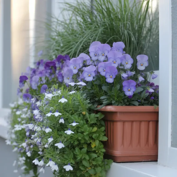 The most effective window box planting for spring combines a trailing plant that spills over the front (lobelia, bacopa, or trailing ivy), an upright mid-height filler (pansies, violas, or primulas), and one taller focal plant at the back or centre (a small ornamental grass or a spike plant). This three-layer approach produces window boxes that look professional and intentional rather than random.