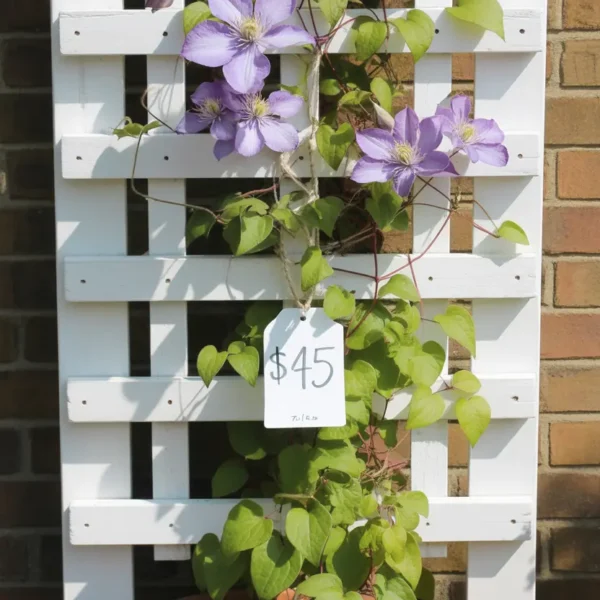 Best trellis placement: Against the wall on either side of the front door, or along the fence panel closest to the gate. Avoid the area directly in front of windows — climbing plants can block light quickly.