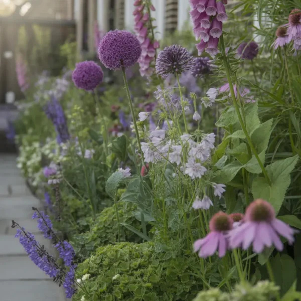 - Allium — spherical purple flower heads on long stems, dramatic and low-maintenance