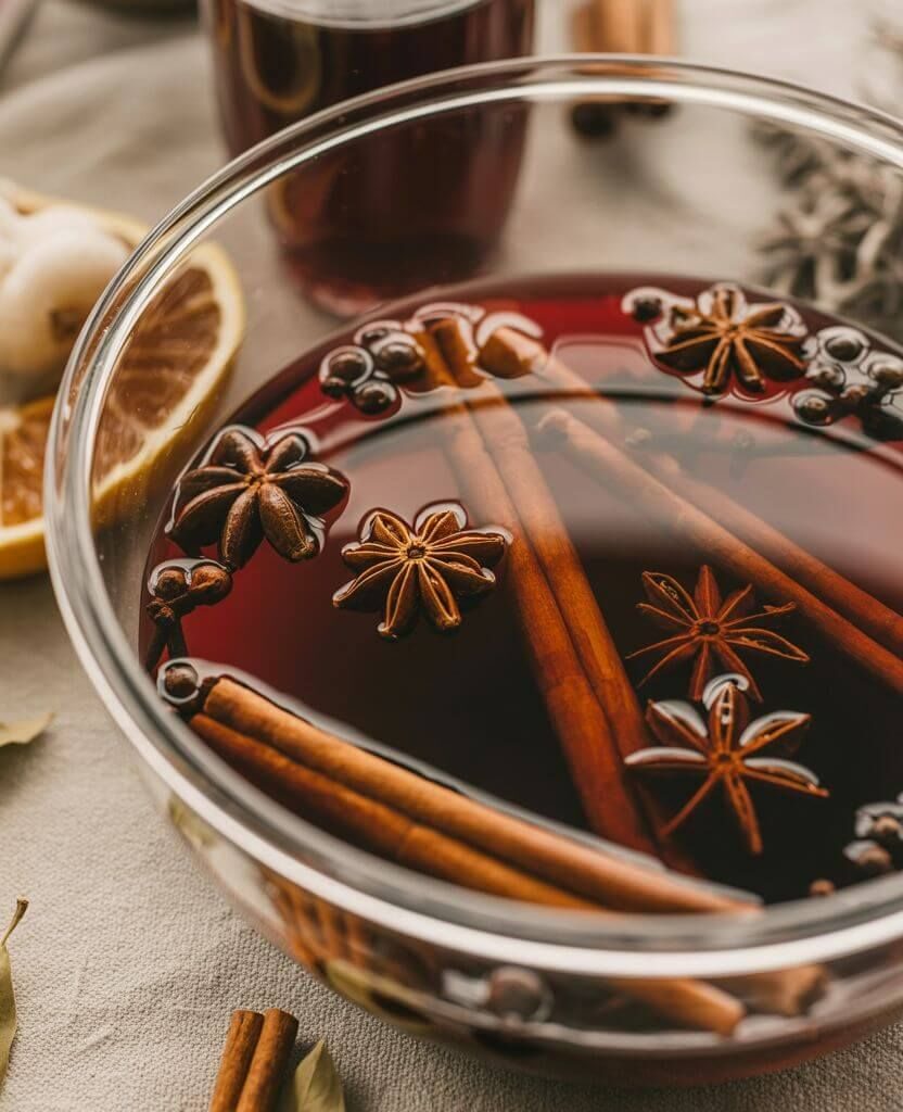 Toss your cinnamon sticks, allspice berries, and cloves straight into the punch bowl. These are the soul of your drink. They’ll infuse every sip with warm, cosy fall flavours that make it taste like a hug in liquid form.